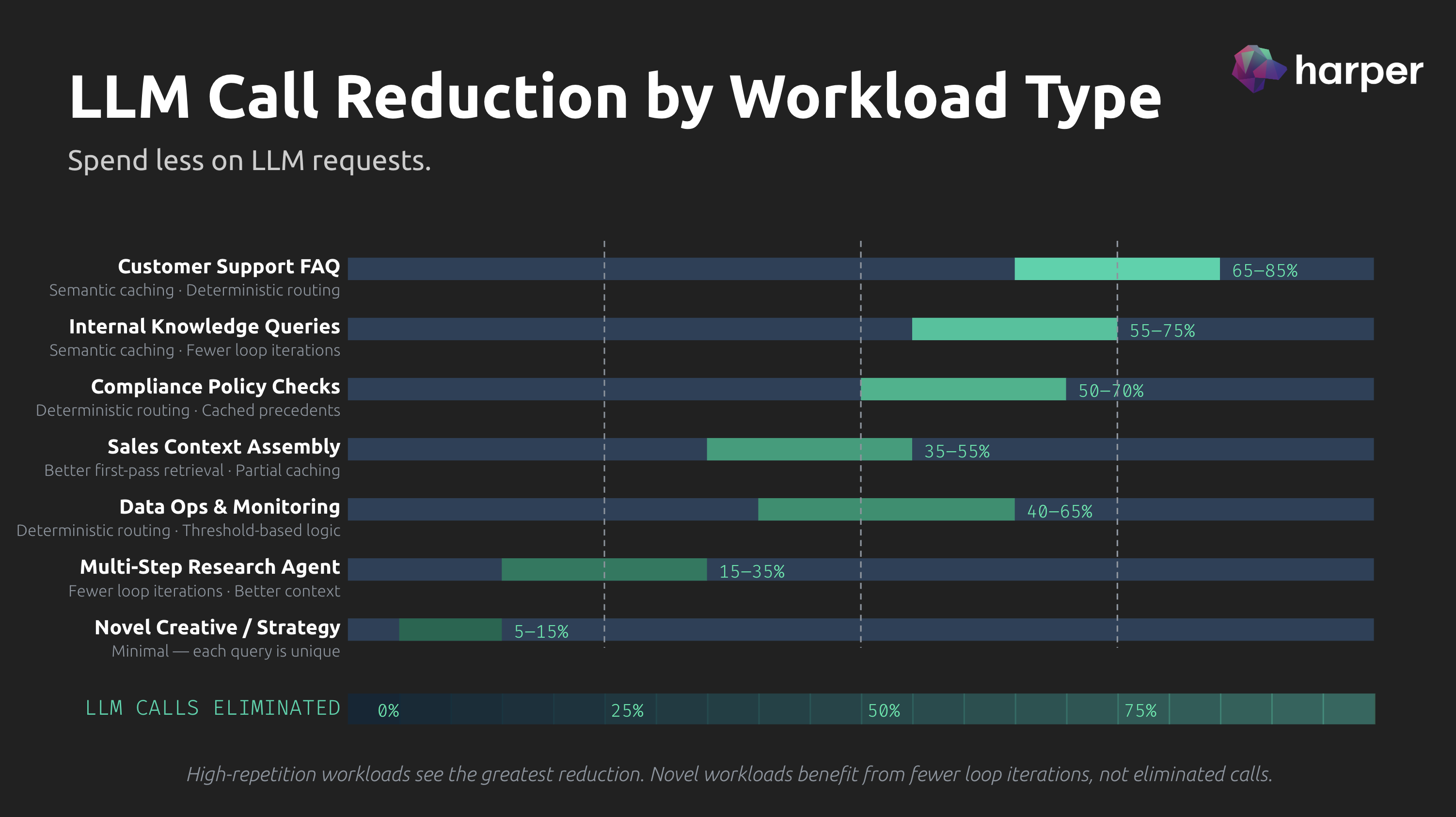 The headline claim that gets thrown around is "60-90% LLM cost reduction." That range is defensible for high-repetition enterprise workloads. Customer support, internal knowledge, compliance. If someone is running a support agent handling thousands of queries a day with a mature semantic cache and good deterministic routing, 70-80% total reduction is realistic.