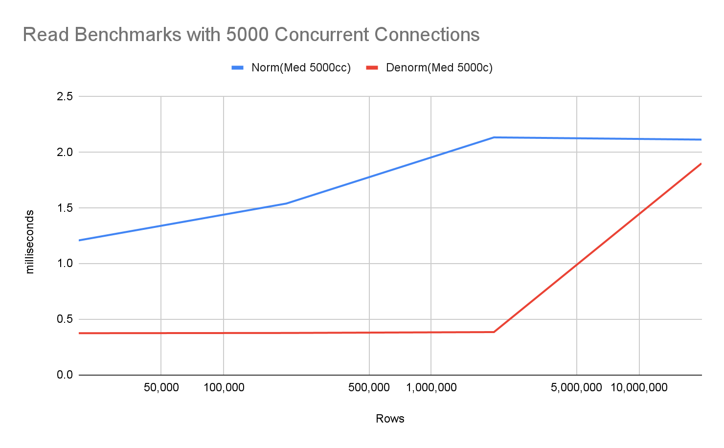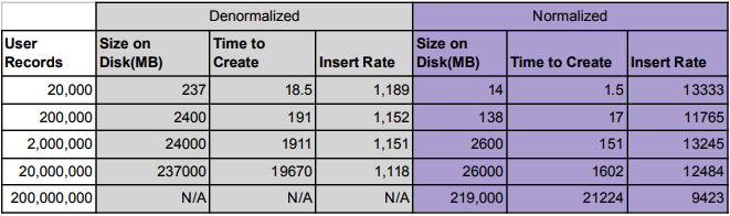 For smaller databases (2 million users and fewer), benchmarks of denormalized and normalized both yield extremely fast response times, but as expected, the denormalized model is fastest with nearly instantaneous, sub-millisecond responses. The throughput of the denormalized model (on a single server) is roughly 30K/s, whereas the normalized model is about 12K/s.