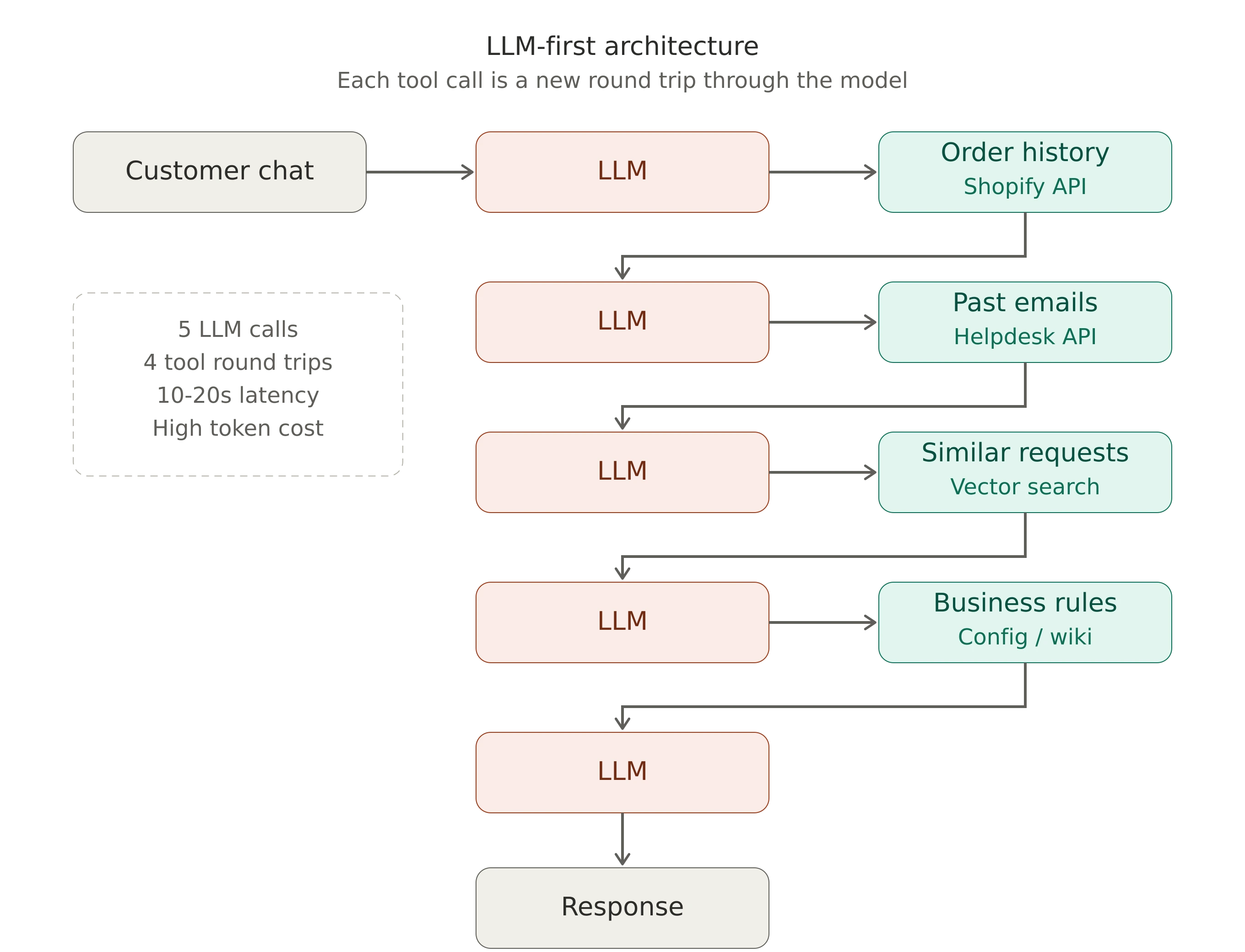 The more fragmented the operating environment, the more expensive the LLM-first pattern becomes. A small brand running on Shopify feels the cost as latency and awkward support loops. A large retailer pulling from an ERP, a warehouse management system, a CRM, a returns platform, and a loyalty program feels it as orchestration overhead, integration complexity, and unpredictable costs that scale with every additional data source.