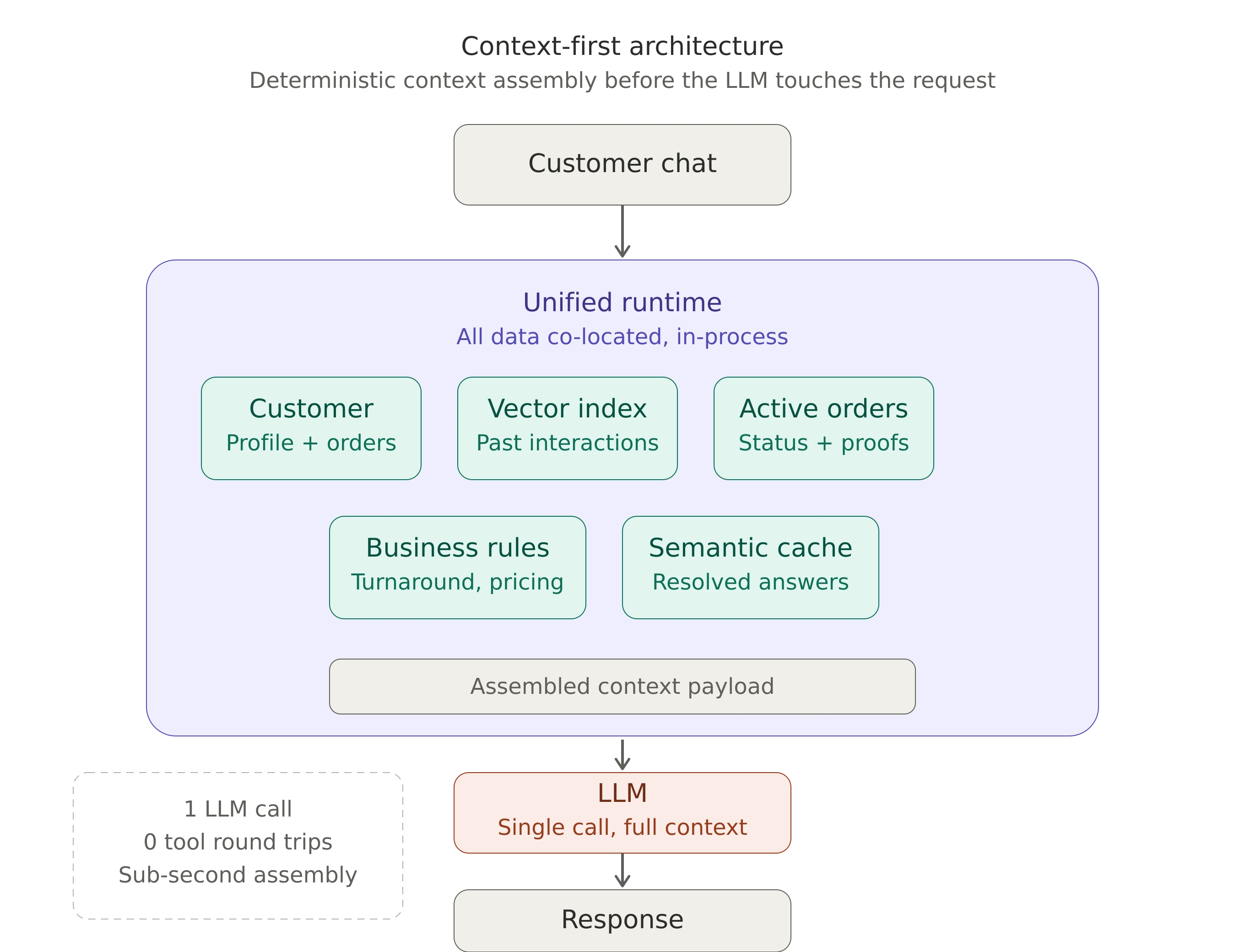 By the time the LLM receives the request, it's not starting from zero. It has the customer's history, semantically similar past interactions with resolved answers, active order context, and the relevant business constraints. One call. Full context. Clean response.