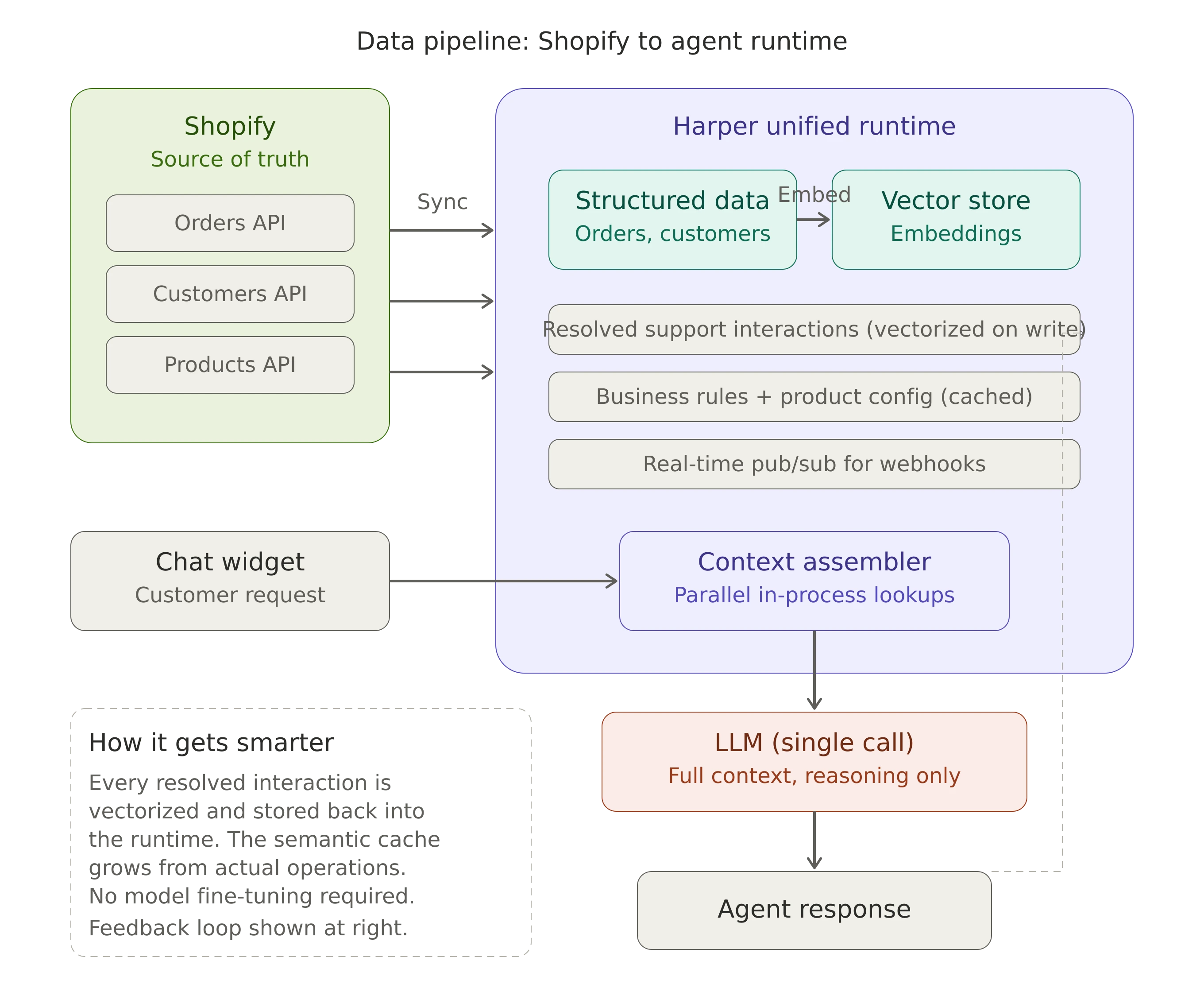 Step one: Sync your Shopify data into a runtime that supports both structured queries and vector search. Customer records and order history come in as structured data. Every resolved support interaction gets embedded and stored as vectors alongside the structured records they relate to. Shopify's webhook system keeps this in sync as orders are created, updated, and fulfilled.