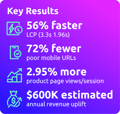 This retailer manages a broad direct-to-consumer catalog with thousands of products. As organic search continued to drive a growing share of sessions, performance became critical for both customer experience and indexation. Yet Google Search Console showed that the majority of URLs were in the “Poor” category for LCP and CLS, restricting visibility and leaving revenue untapped. Leadership recognized that without a step-change in performance, marketing spend would plateau in effectiveness, and growth would stagnate.