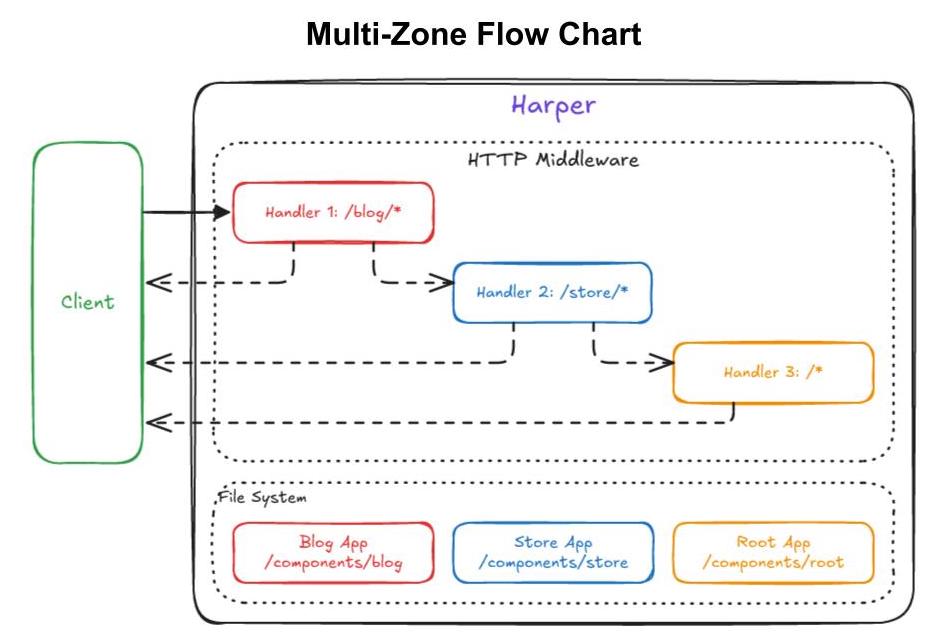 - Multi-zone hosting: Several Next.js apps, each at different paths, running in one Harper process.